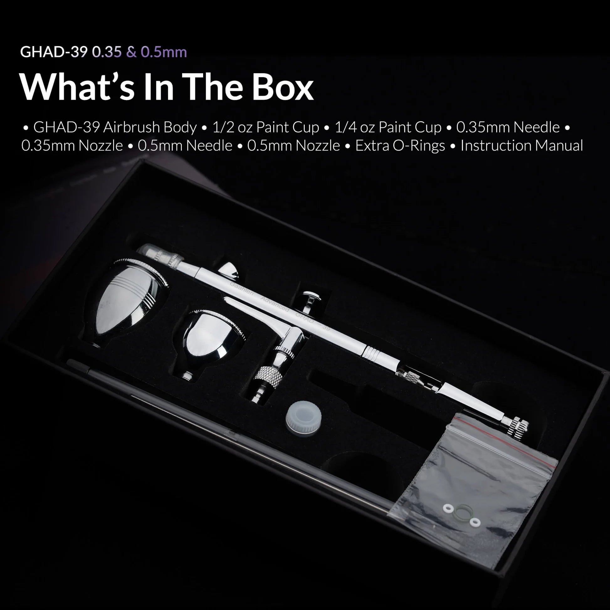 ✔️ GHAD‑39 body   ✔️ 0.35 mm needle + nozzle (pre‑installed)   ✔️ 0.5 mm needle + nozzle   ✔️ 7 ml cup   ✔️ 15 ml cup   ✔️ Needle limiter   ✔️ Quick‑disconnect   ✔️ Cup cap   ✔️ Lubricant   ✔️ Spare o‑rings   ✔️ Manual