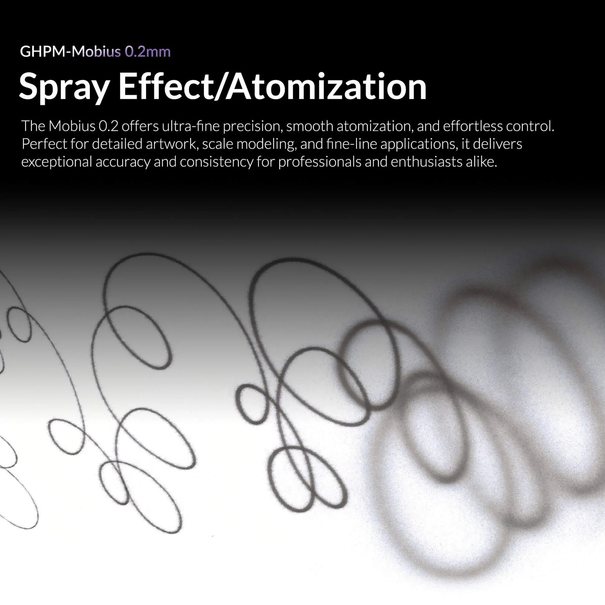 The detail specialist in the Mobius family. A 0.2 mm dual‑action gravity‑feed airbrush built specifically for ultra‑fine work — freehand, edge highlights, panel lining, micro‑camo patterns, and precision glazing. This is not an all‑rounder. It's the scalpel you reach for when your 0.3 mm isn't precise enough, with a dedicated precision air control knob that only ships on the 0.2 mm version.