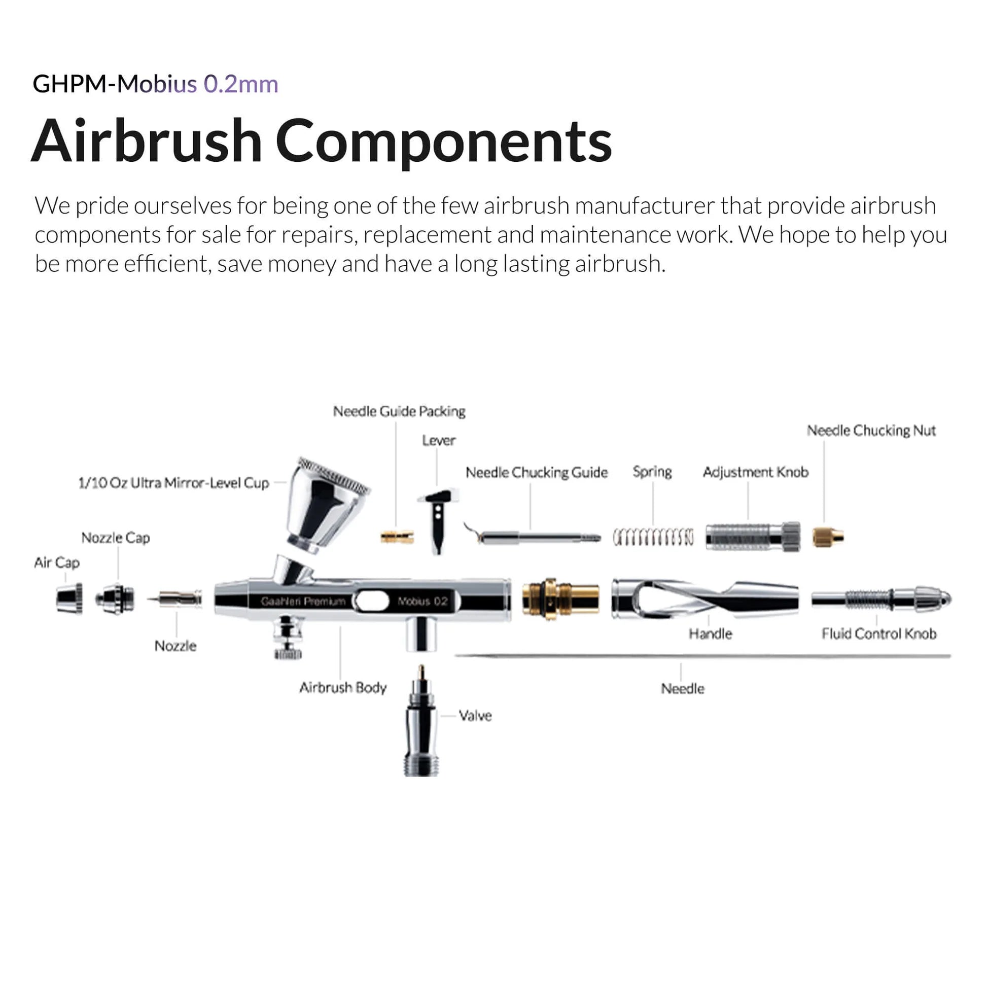 Gaahleri Mobius 0.2mm airbrush parts diagram showing needle nozzle and components