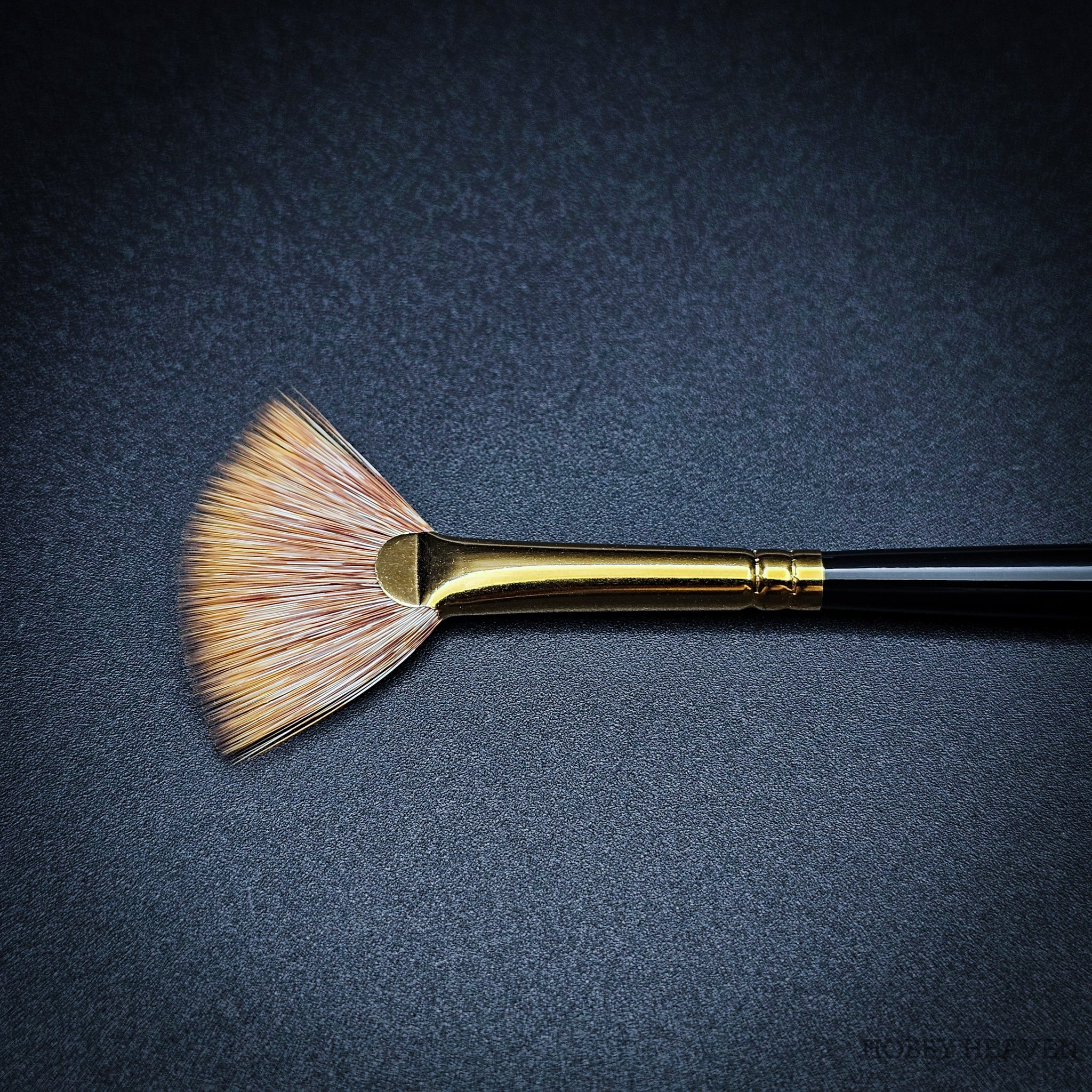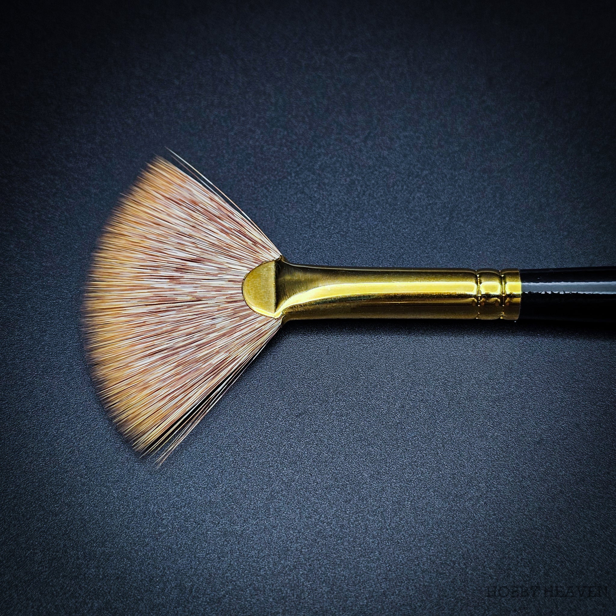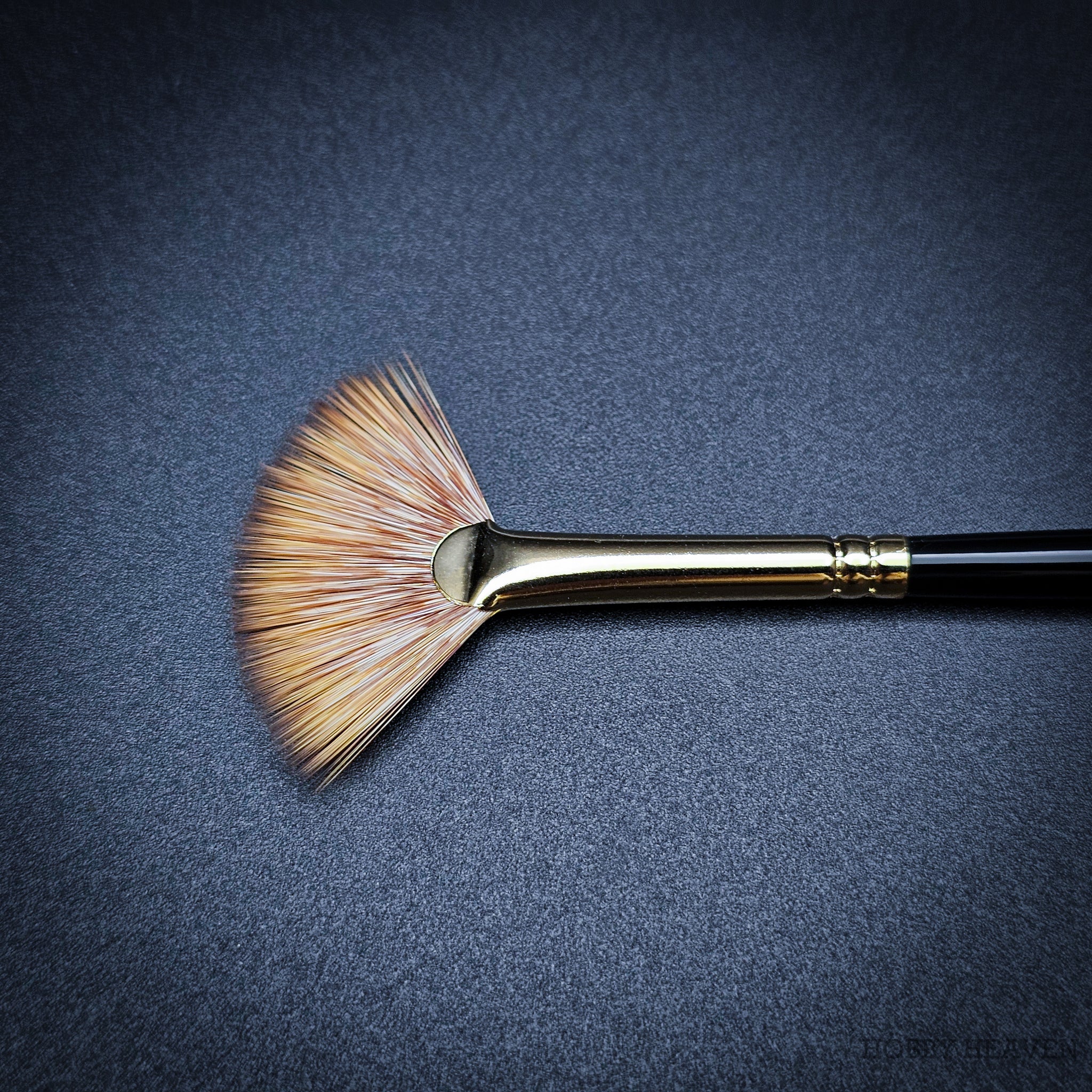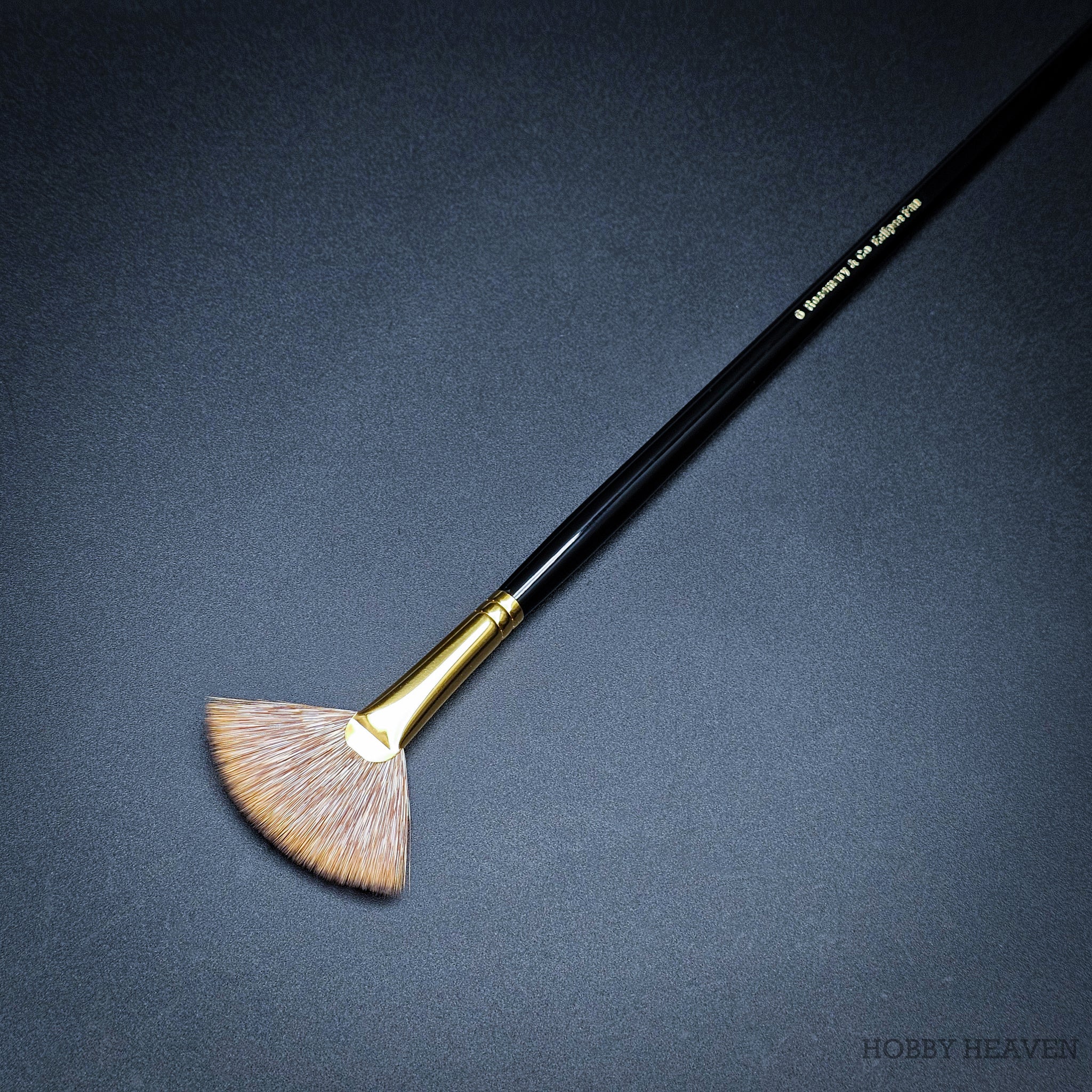 100% synthetic mongoose fan brush – stiffer than sable, softer than hog bristle. The flattened ferrule spreads fibres into a wide fan shape, creating distinctive marks ideal for grass, fur, foliage, clouds, and smoke effects. Springy enough to push paint effectively, soft enough for delicate edge blending. Vegan friendly, cruelty-free, made in the UK.