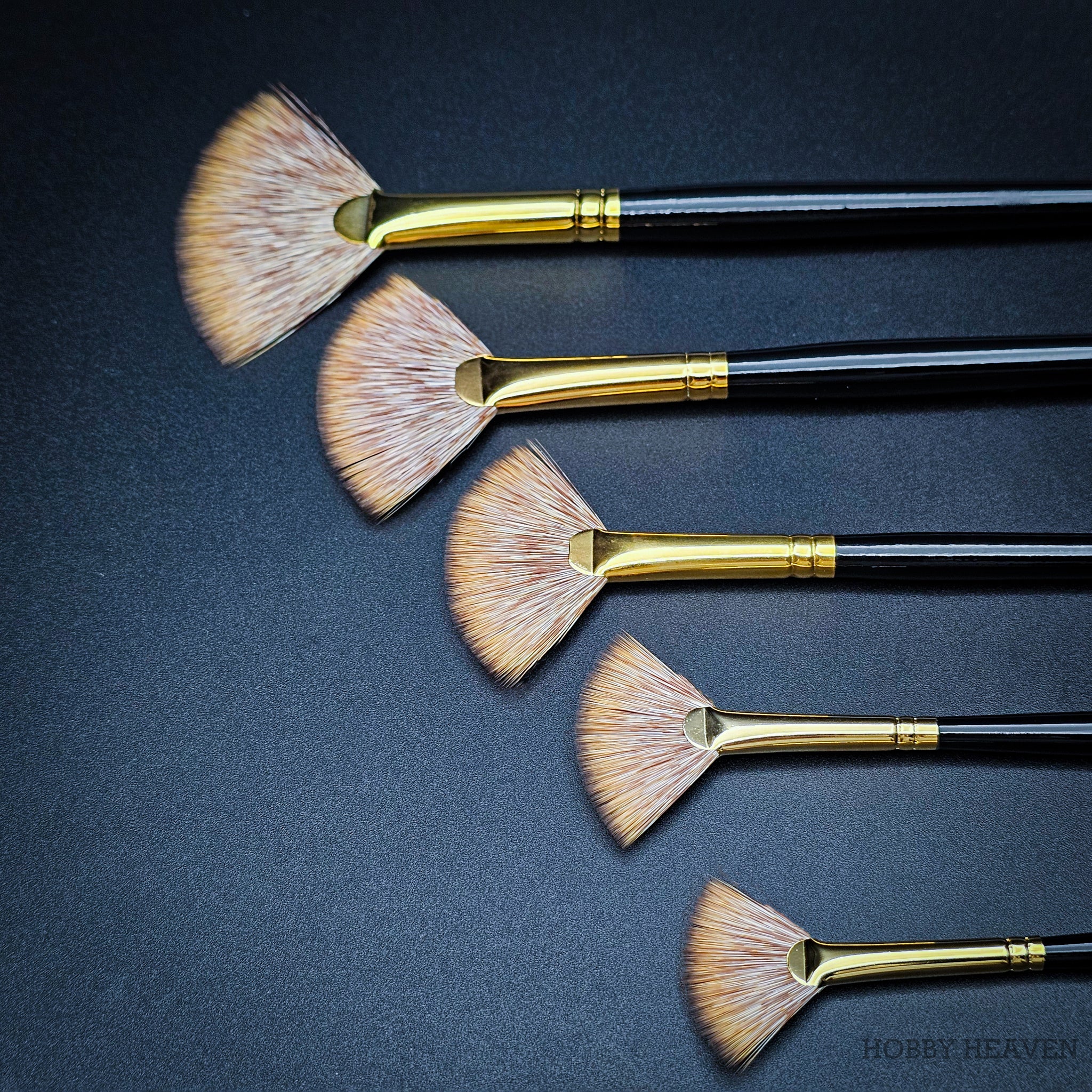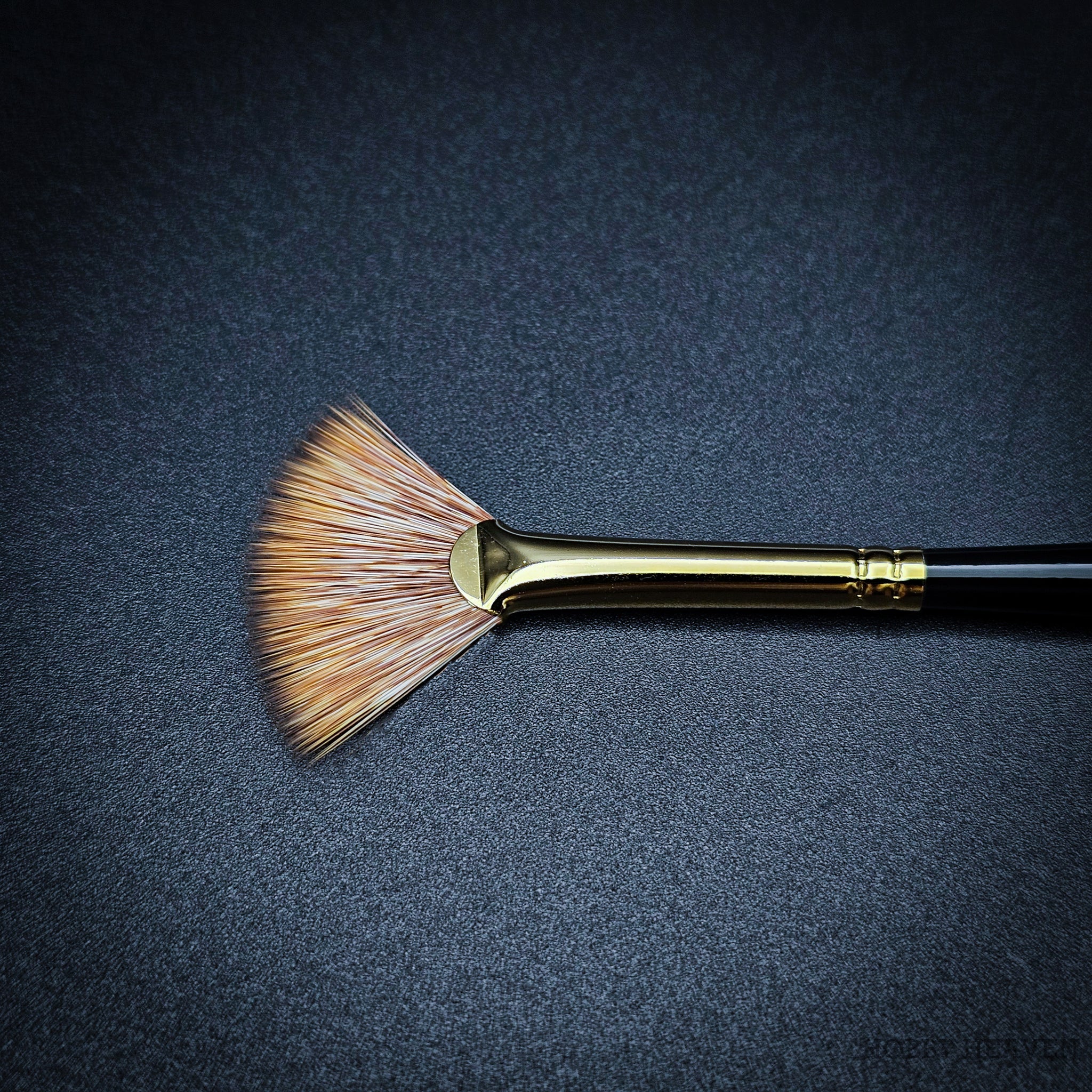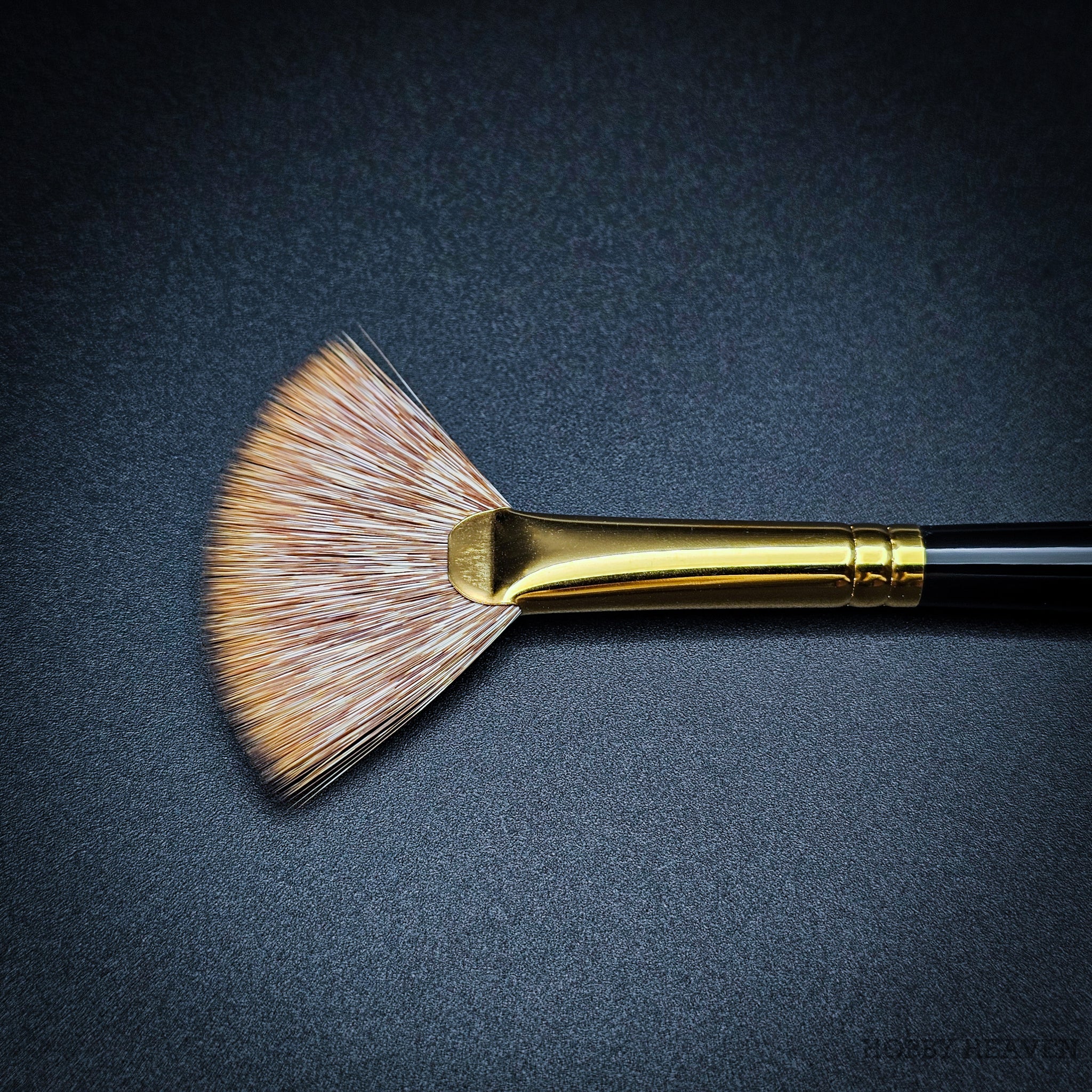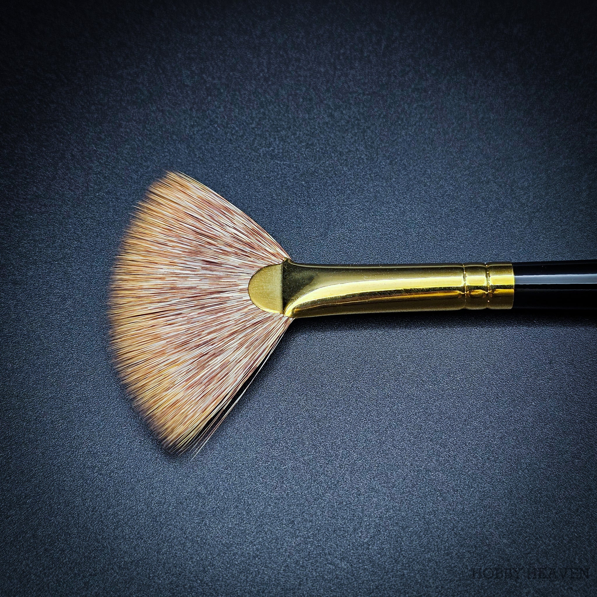 100% synthetic mongoose fan brush – stiffer than sable, softer than hog bristle. The flattened ferrule spreads fibres into a wide fan shape, creating distinctive marks ideal for grass, fur, foliage, clouds, and smoke effects. Springy enough to push paint effectively, soft enough for delicate edge blending. Vegan friendly, cruelty-free, made in the UK.