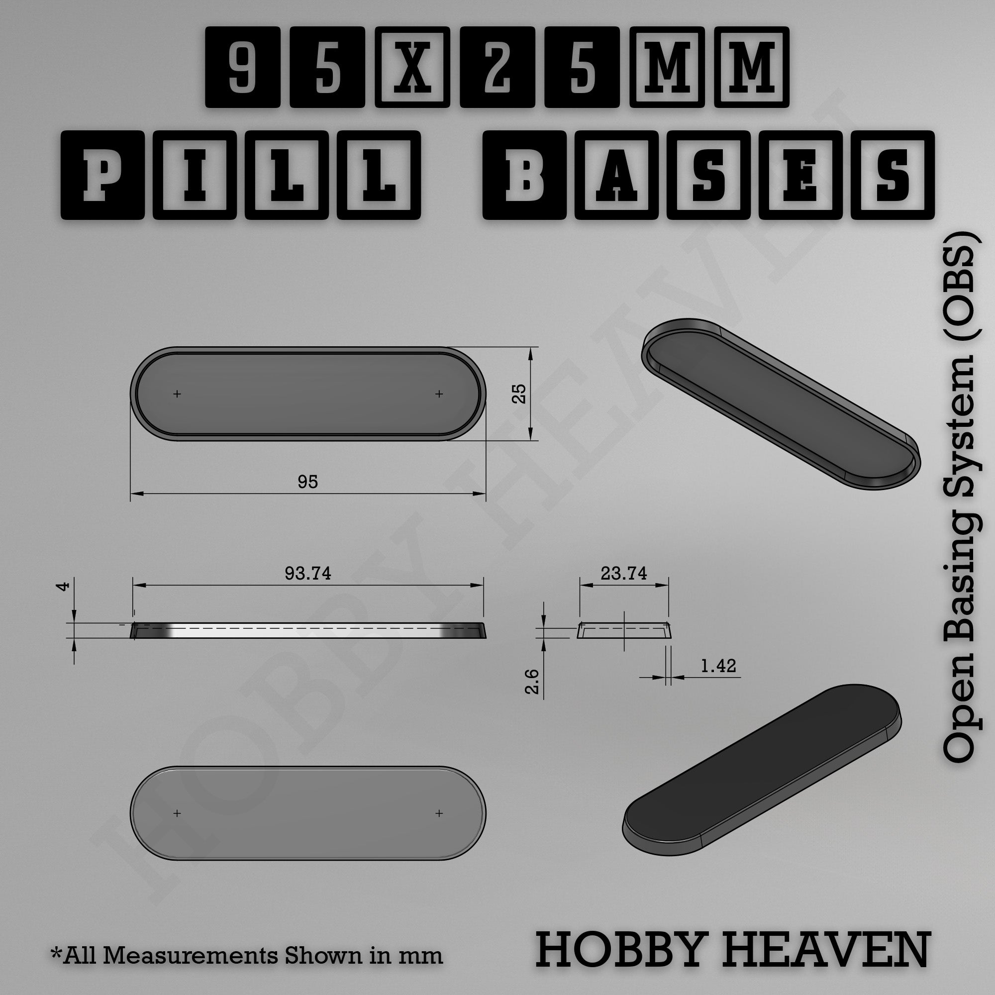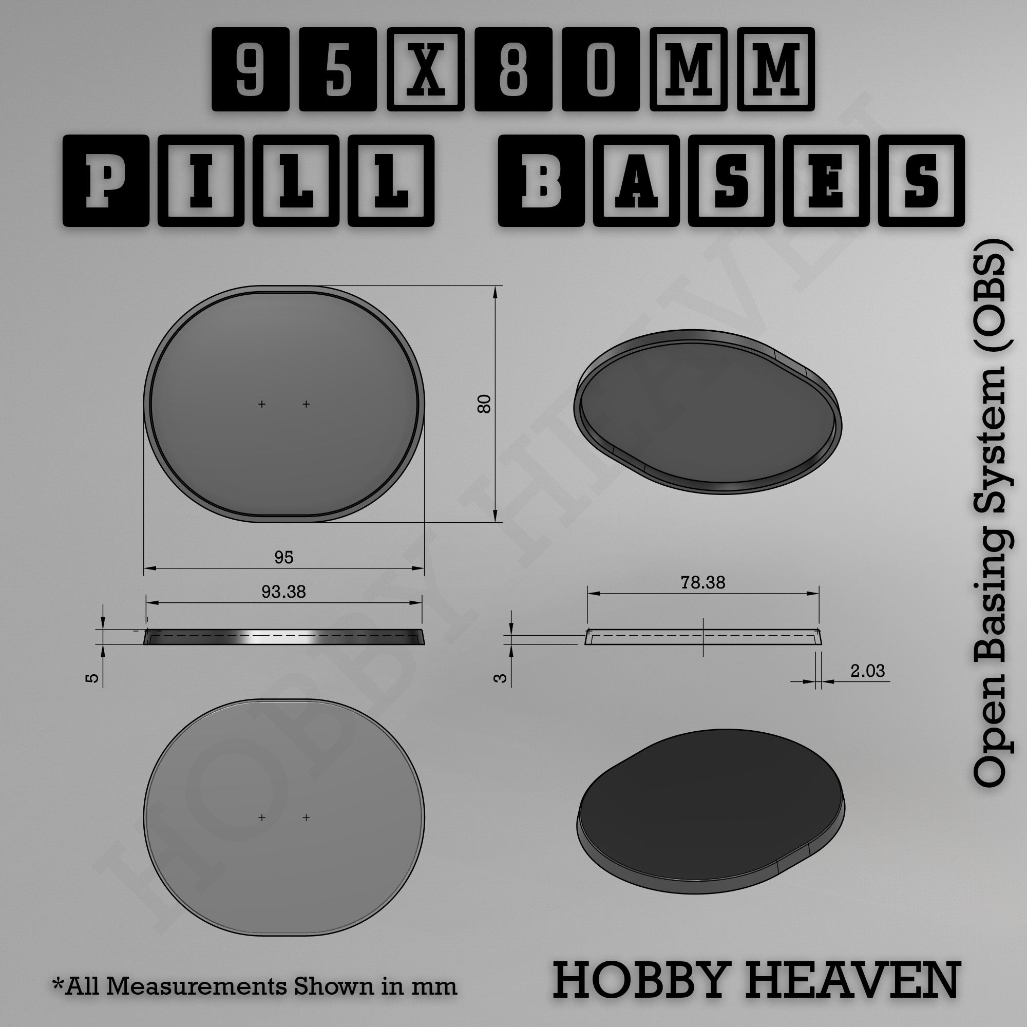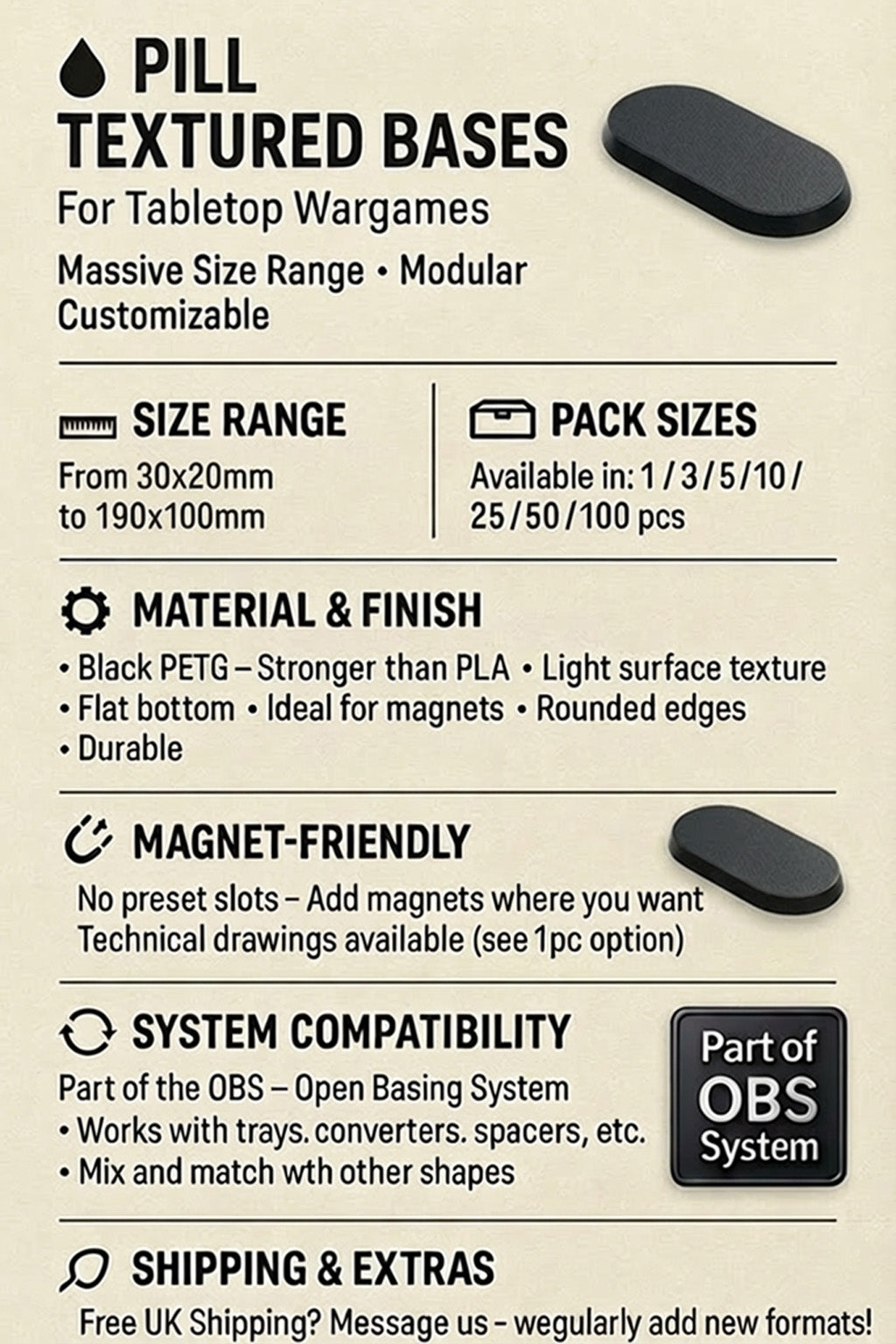Pill/stadium bases are NOT standard for mainstream wargames. They're not used in Warhammer 40K, Age of Sigmar, or most tournament systems. Check your game's rules before buying. Ideal for custom projects, display models, vehicles, and homebrew gaming where you set the rules.