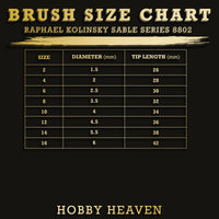Raphael 8802 Kolinsky Sable Rigger brush size chart with diameter and tip length for miniature painting and fine details