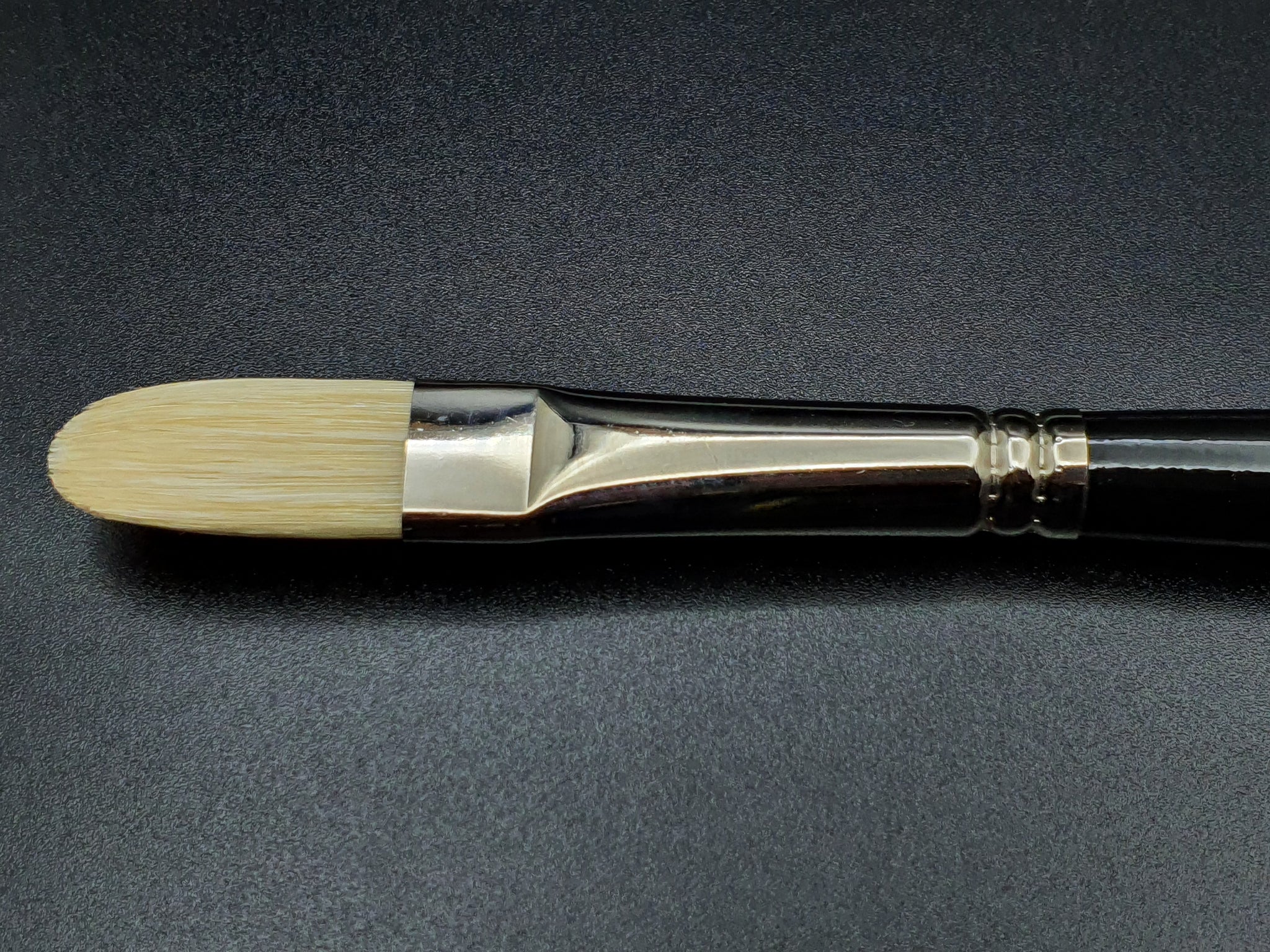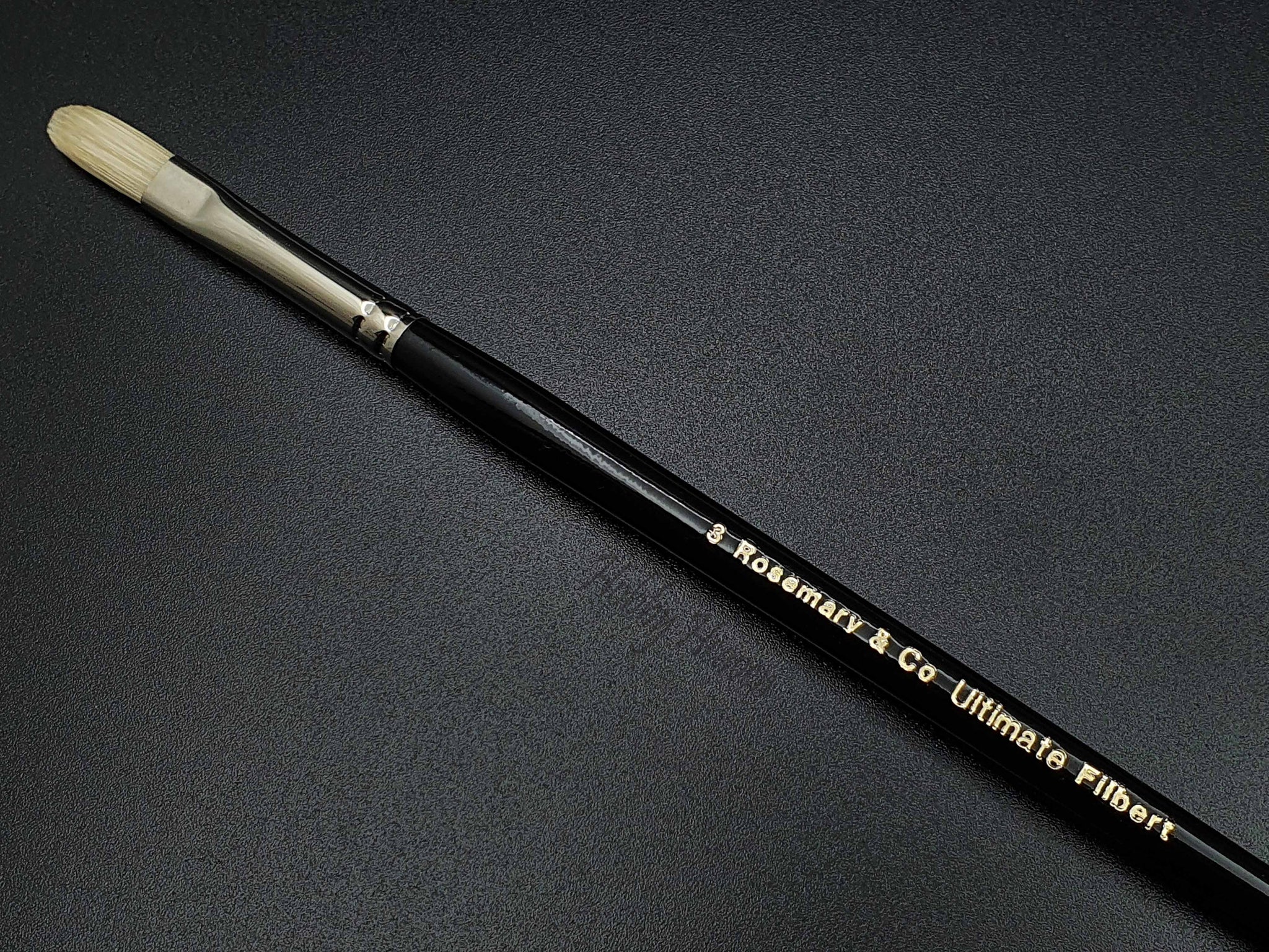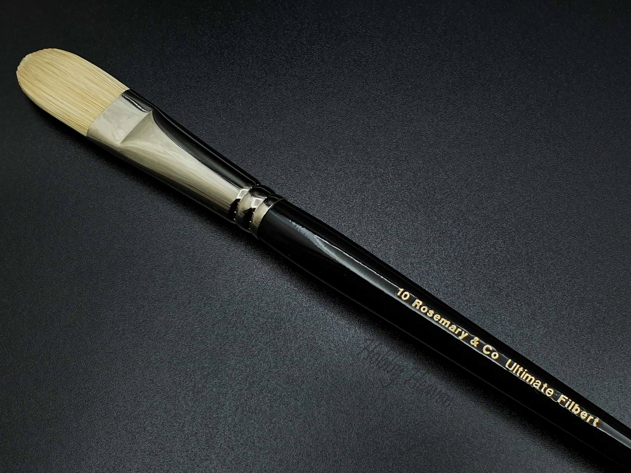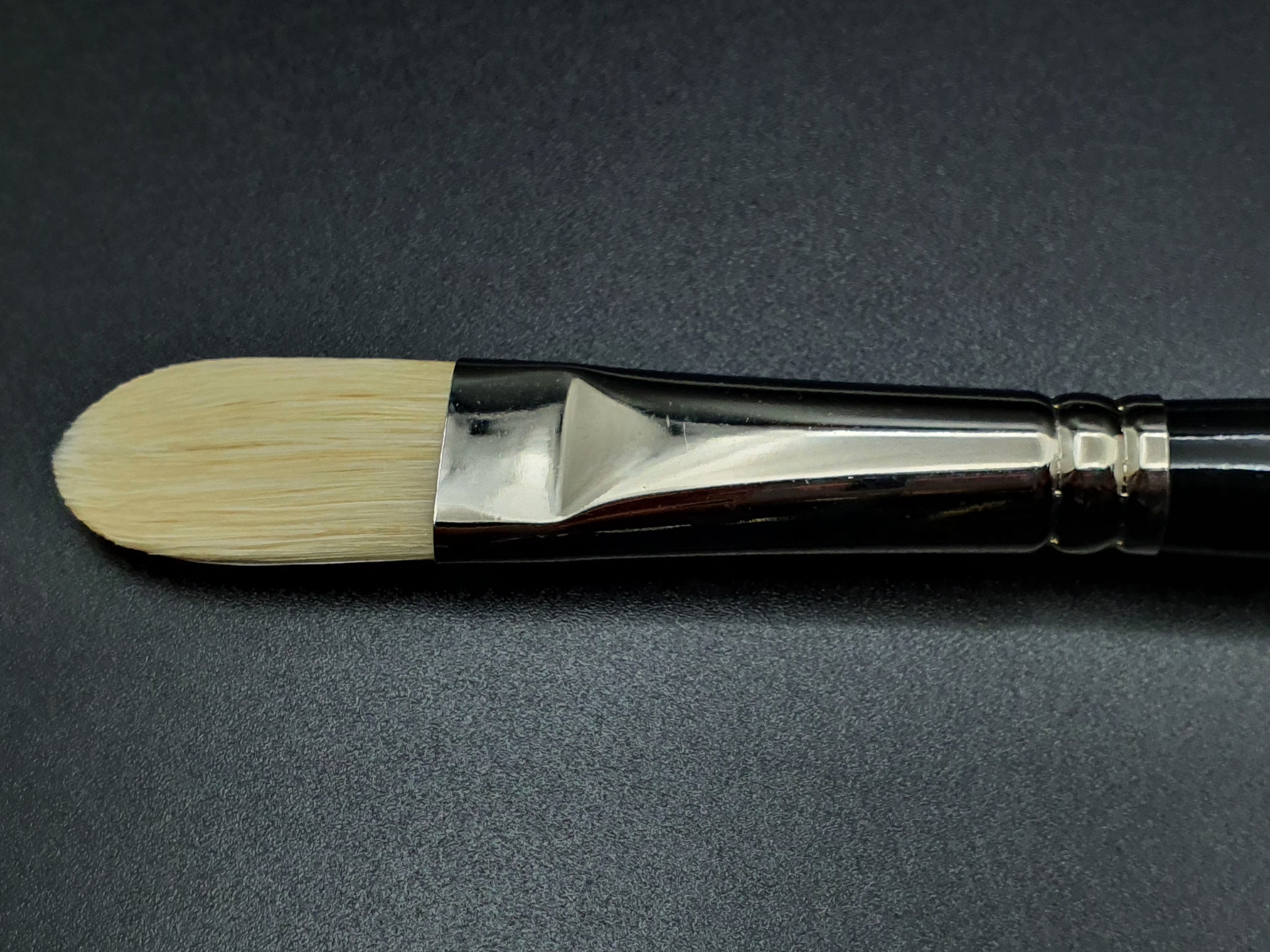 The bristle offers medium-firm spring with a deliberately textured, grainy release. It holds its shape under heavy paint and loads well for strong directional strokes. Compared to synthetic filberts, expect more splay and more texture — that's by design. If you prefer a cleaner, more controlled edge, Rosemary & Co's Ivory Filberts (synthetic) are worth considering. If you want raw, painterly marks with real bristle character, this is the one.