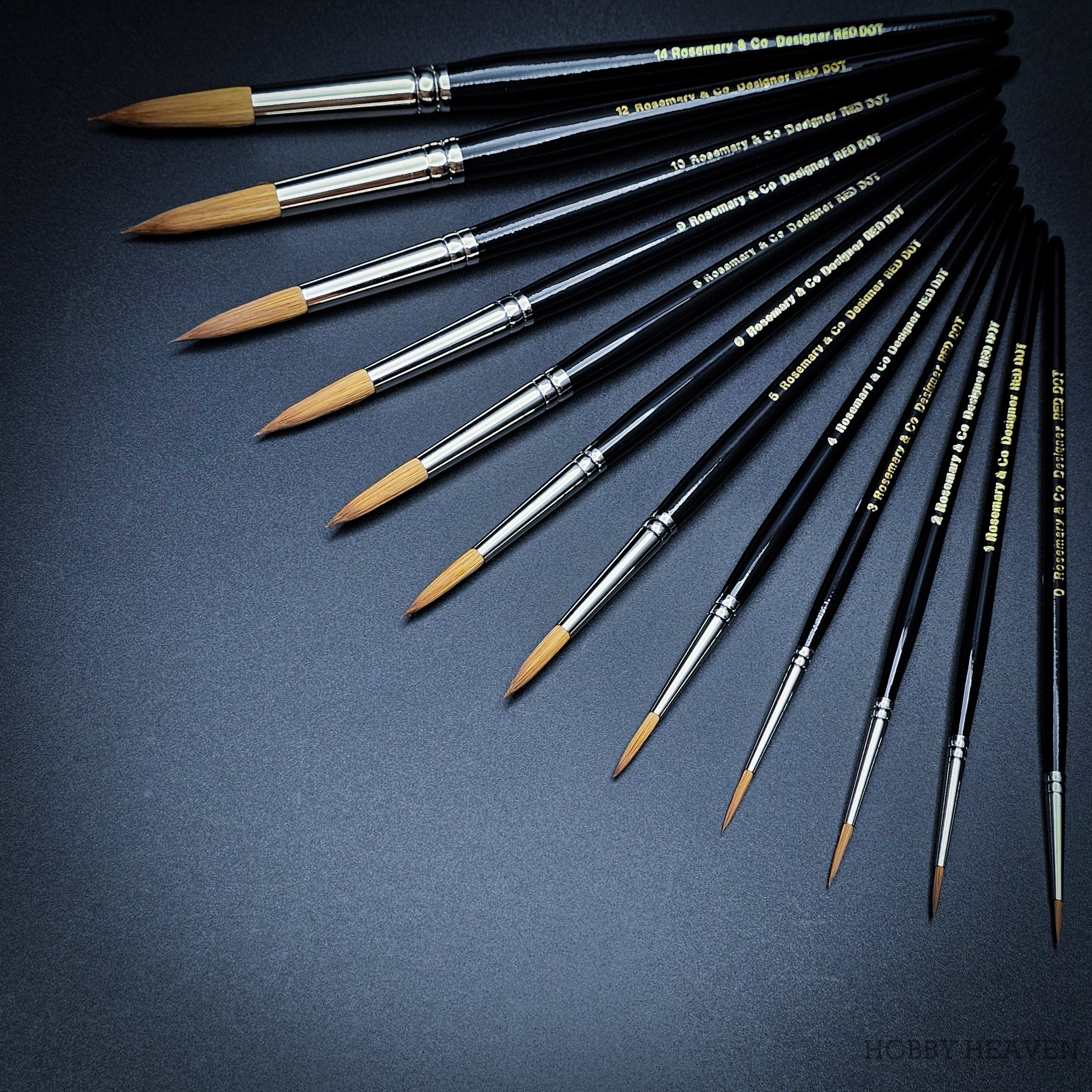 Experience the perfect balance of precision and fluid paint delivery with Rosemary & Co Red Dot Designers Brushes. These professional-grade synthetic brushes feature a unique longer, finer profile compared to standard rounds, giving you exceptional control with greater paint capacity. Preferred by professional artists, illustrators, and miniature painters worldwide. 100% vegan.