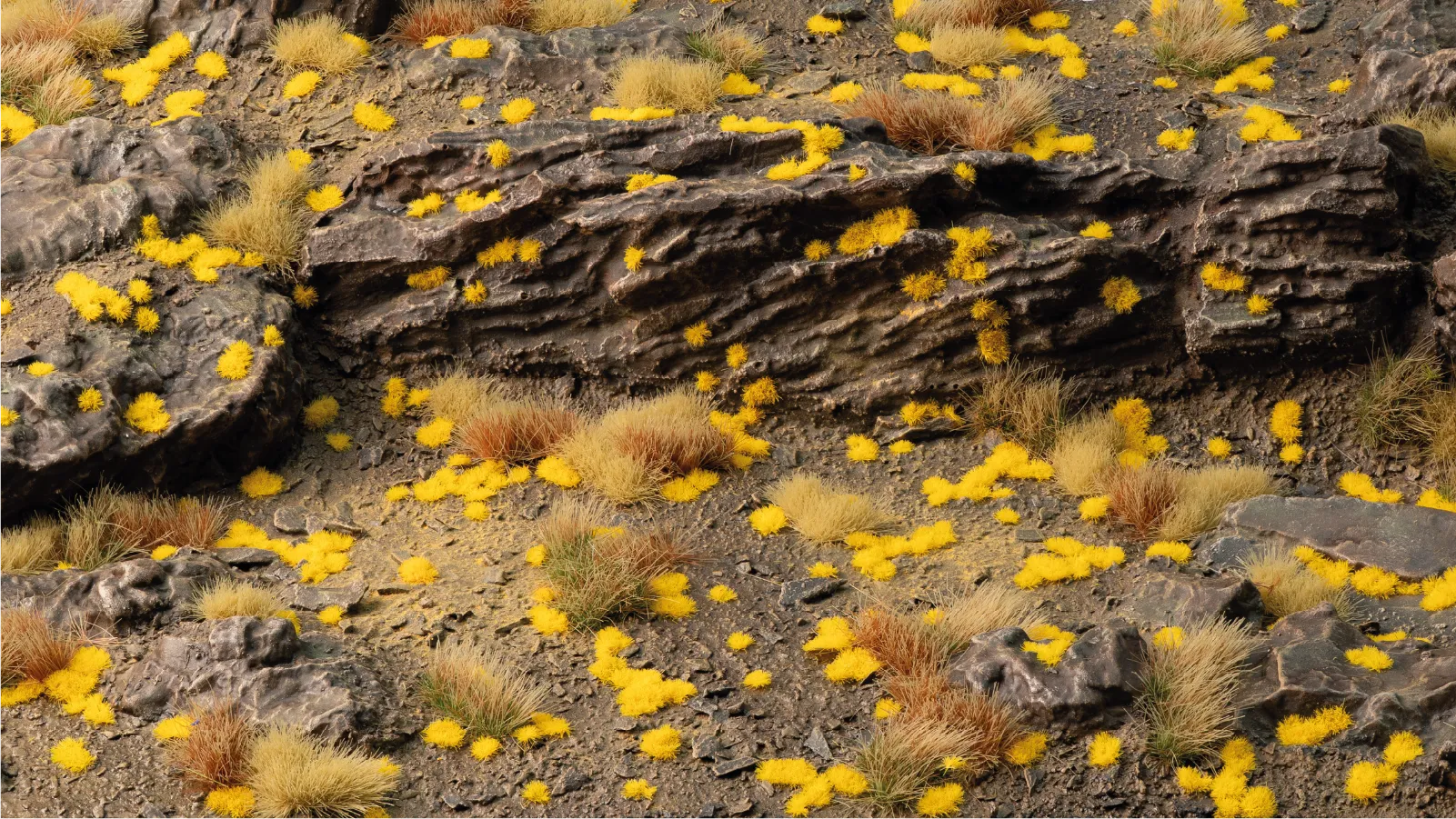 Standard grass tufts are 4-6mm tall. These are 1mm. That difference changes what they represent entirely. Tiny Golden tufts are not grass — they are lichen, sun-dried moss, micro-vegetation on rocks and the kind of low golden growth you see clinging to exposed stone and bare ground. At just 1mm, they add a layer of texture detail that simply is not possible with conventional tufts.